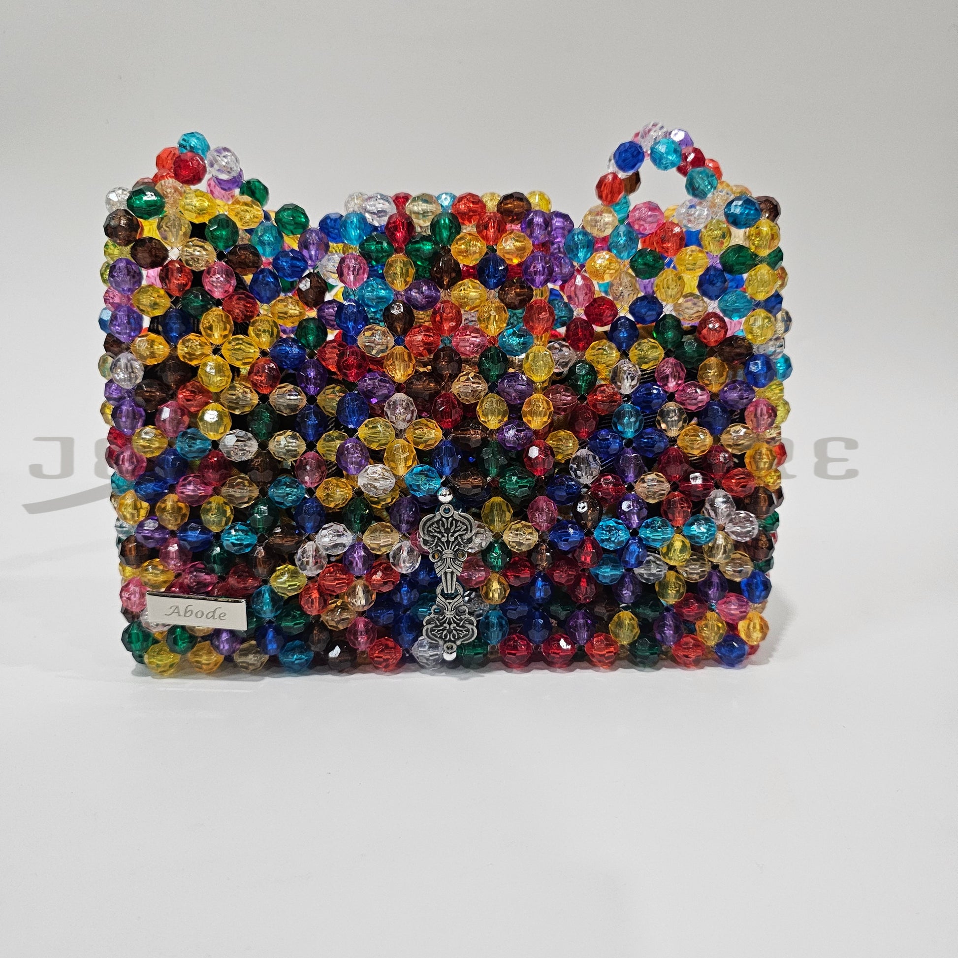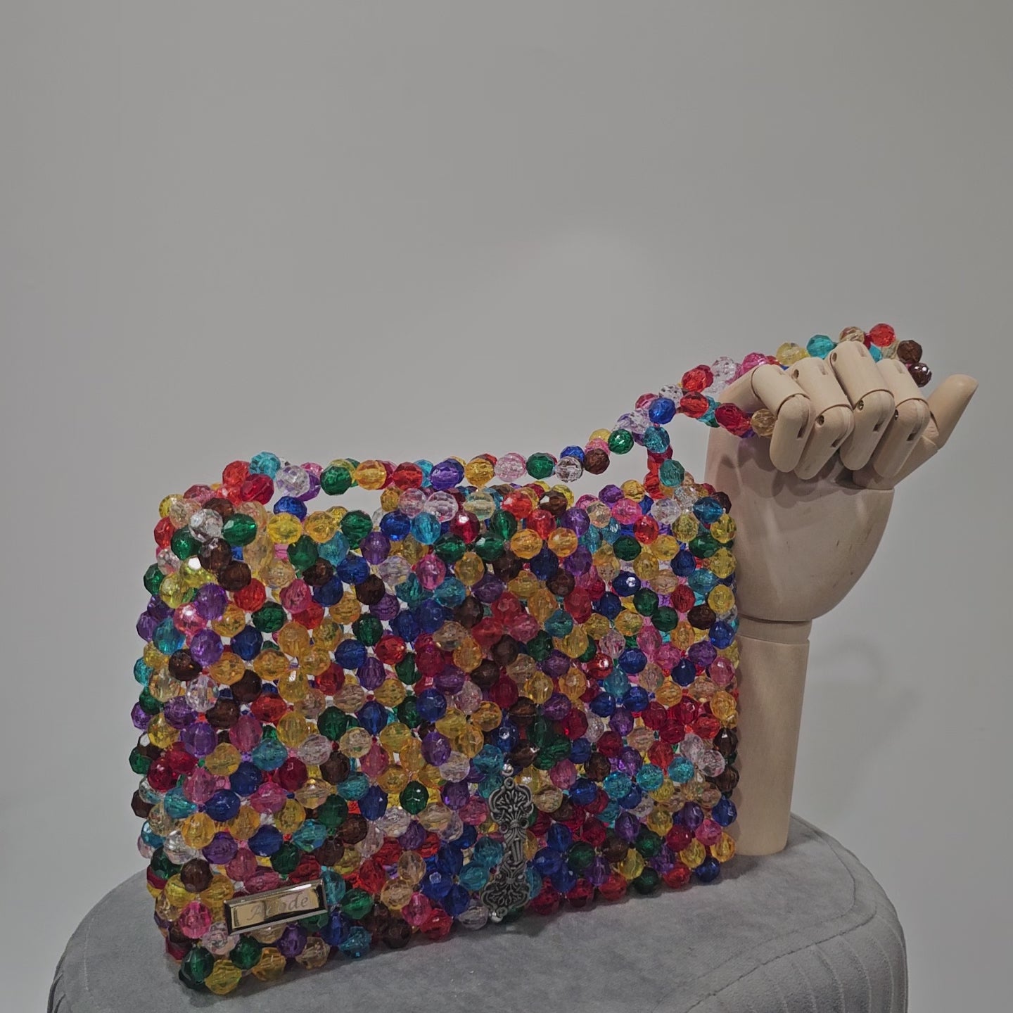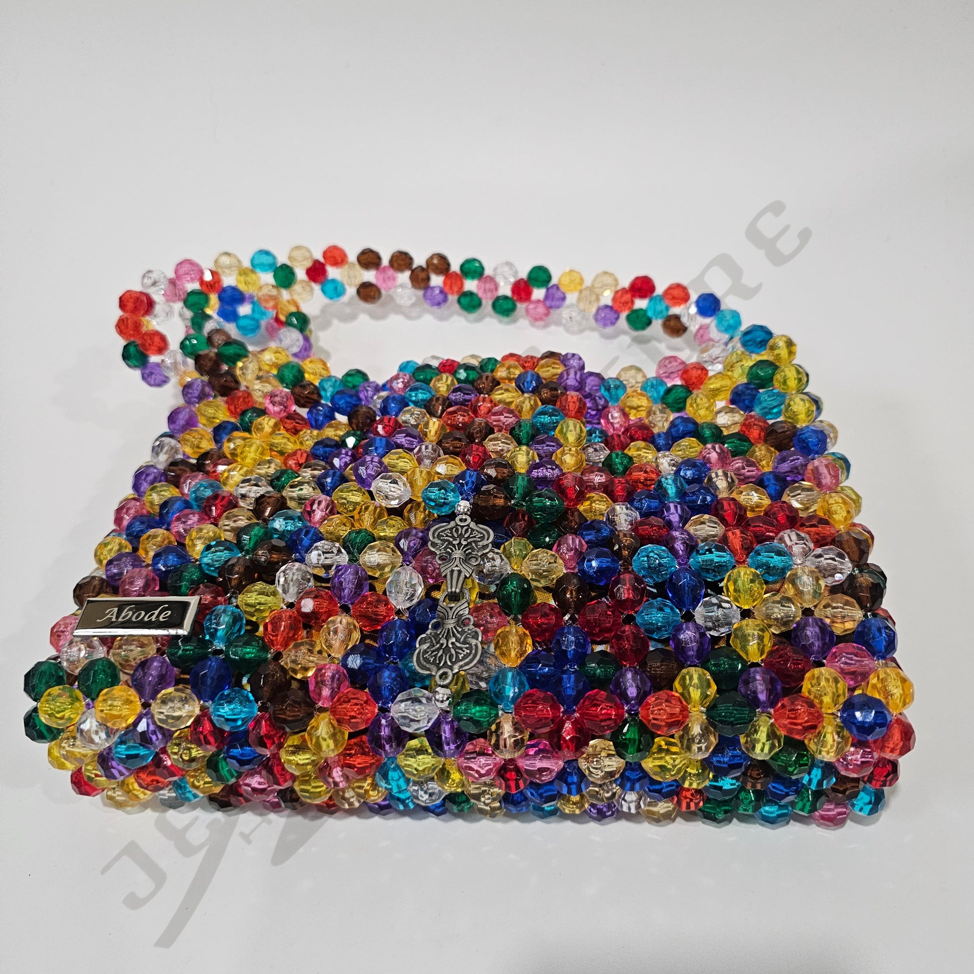 This cautiously assembled multicolor beaded bag is crafted from chunky clear faceted beads with beaded handle. This will carry you from day to night up-to-the-minute.