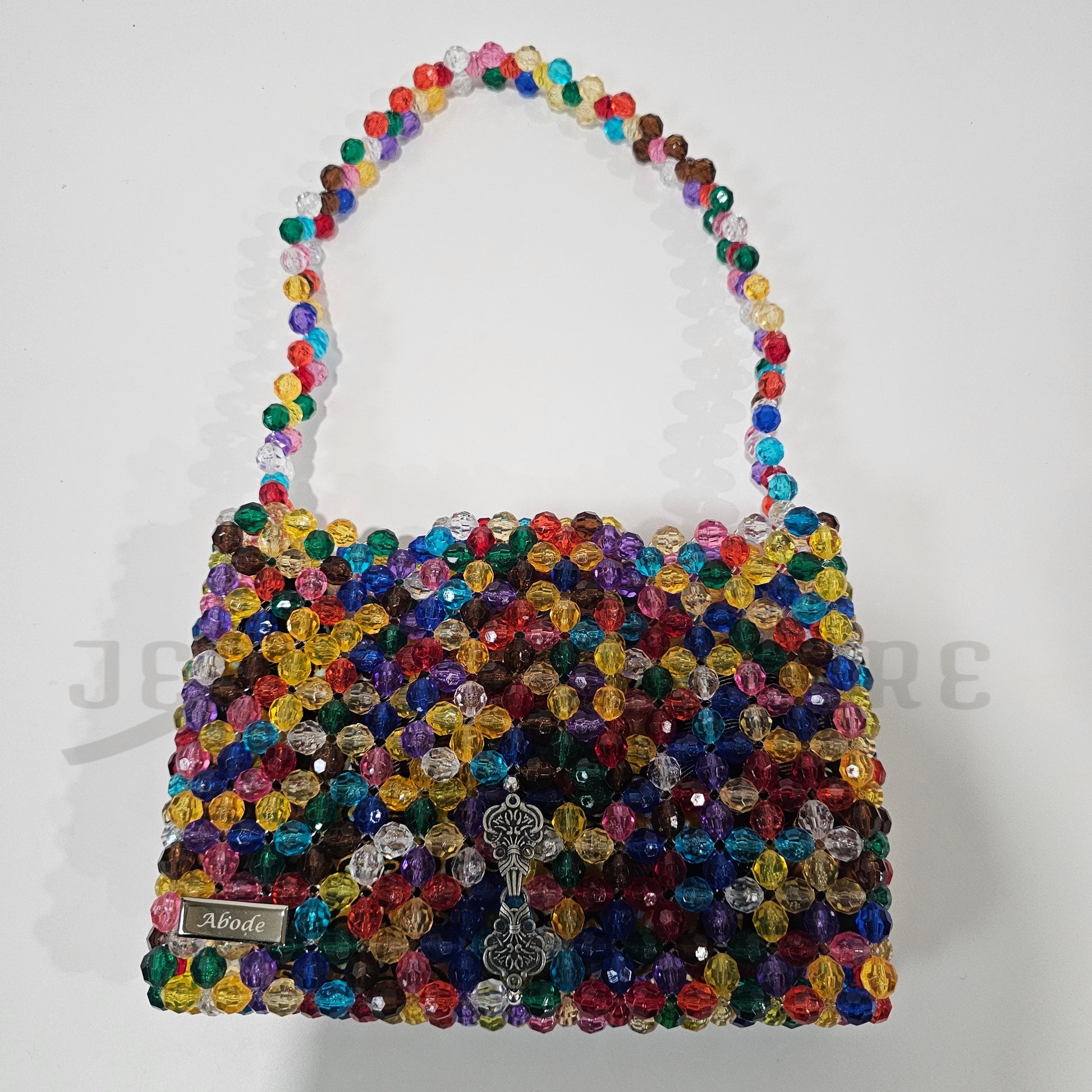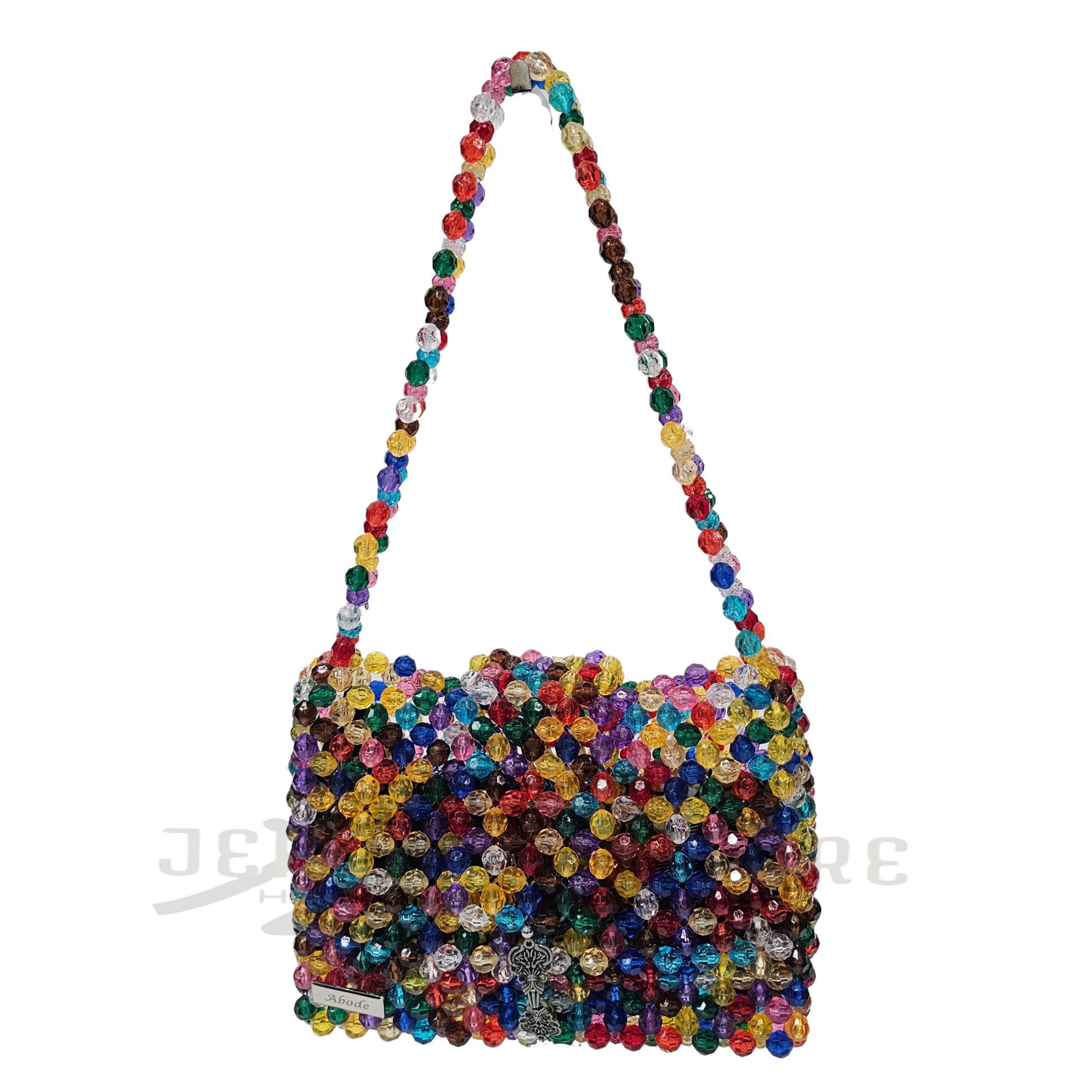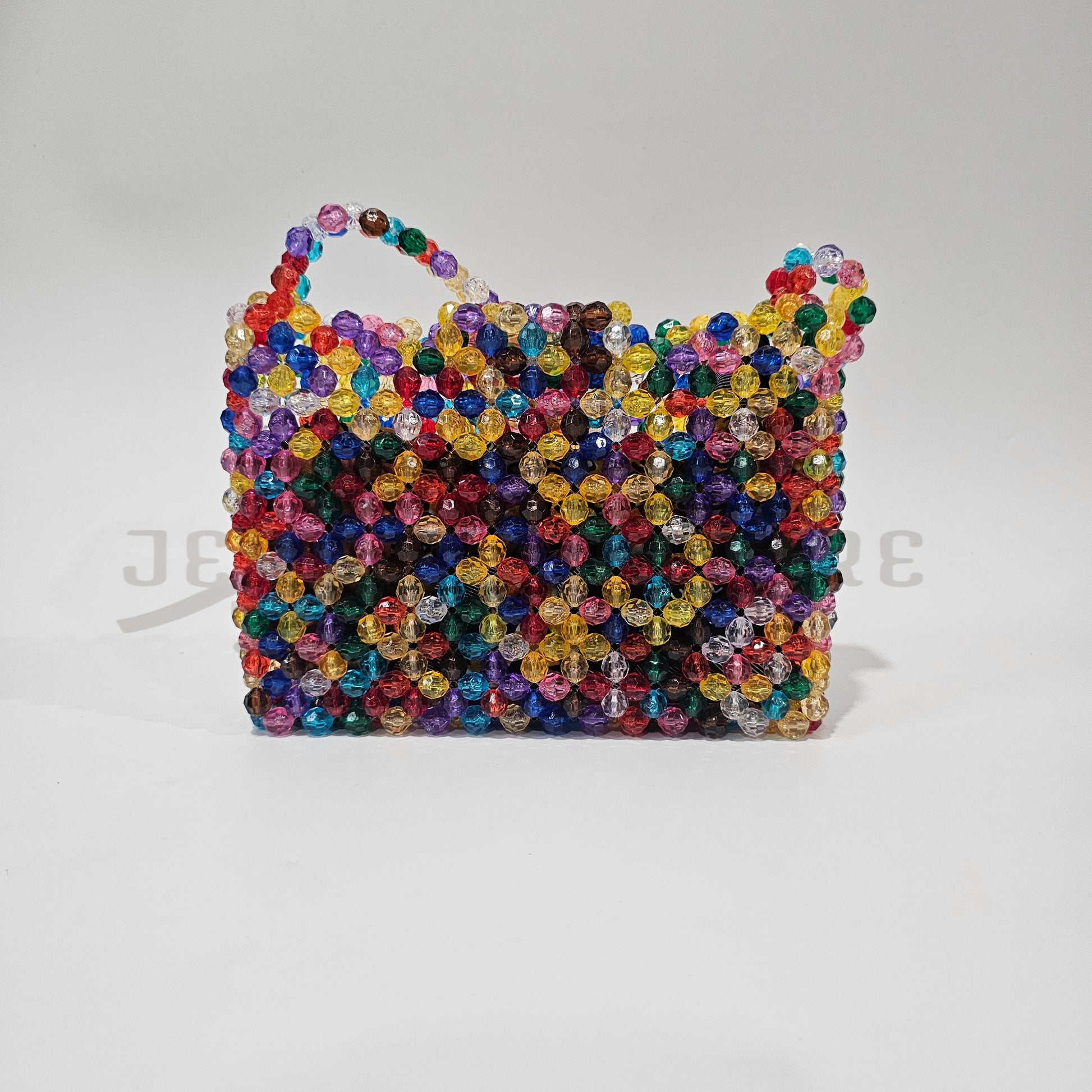 This cautiously assembled multicolor beaded bag is crafted from chunky clear faceted beads with beaded handle. This will carry you from day to night up-to-the-minute.